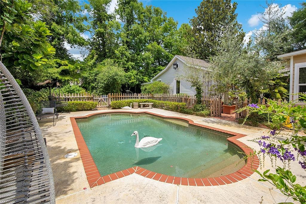 A charming backyard features a family-sized swimming pool bordered by a brick-lined edge and surrounded by a spacious concrete patio. The pool is the centerpiece, with a playful swan float adding a fun touch, perfect for children and relaxing afternoons. Lush greenery and mature trees create a private, tranquil atmosphere, while a classic wooden picket fence encloses the yard for added safety. A detached cottage-style outbuilding sits in the background, complementing the home’s inviting appeal. Comfortable outdoor seating and flowering plants enhance the friendly, welcoming vibe, making it an ideal spot for gatherings or playtime in a secure environment.
