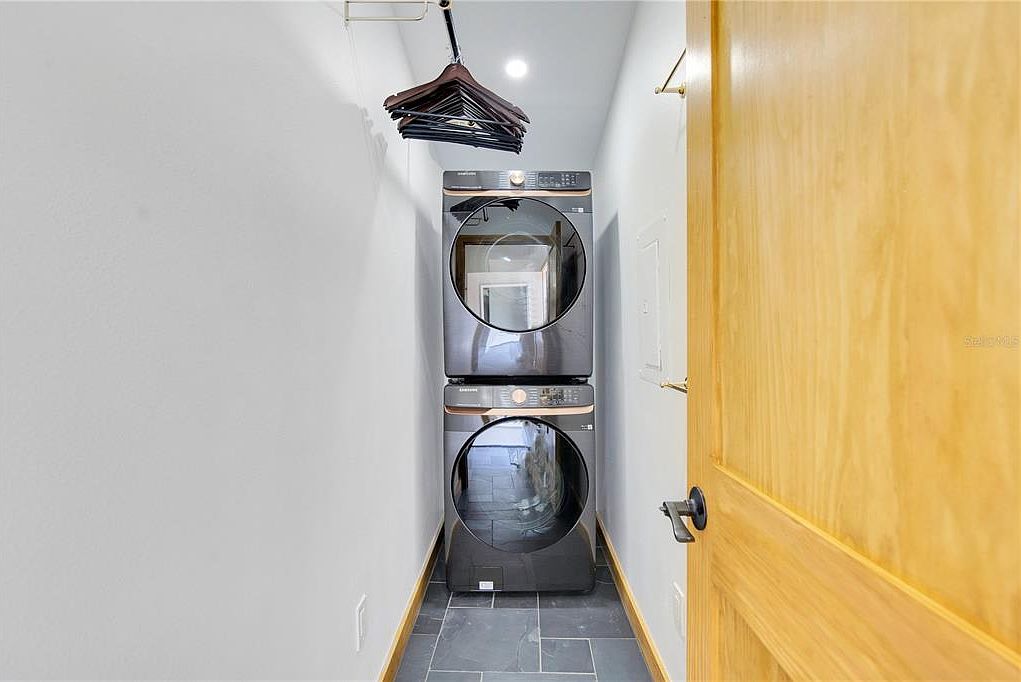 This laundry closet features a sleek, modern design with a stacked washer and dryer positioned against the far wall, maximizing usable space for busy families. The laundry machines are a dark metallic color, providing a sophisticated contrast to the pale gray walls. The space is illuminated by a recessed ceiling light, brightening up the compact area. The floor is finished with large, modern dark slate tiles, easy to clean and perfect for high-traffic family use. A wooden door with warm tones frames the entryway, and above the appliances, a rack with wooden hangers offers convenient clothes drying and organization.