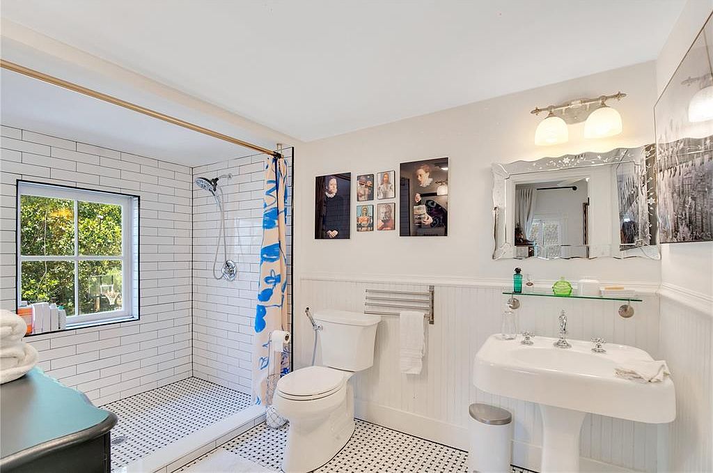 Spacious and bright, this family bathroom features a walk-in shower with white subway tiles and a large double-pane window that brings in natural light and offers a serene view of greenery. The floor boasts timeless black-and-white mosaic tiles that complement white wainscoted walls, enhancing the clean and welcoming atmosphere. The room includes a pedestal sink with modern chrome fixtures and an elegant scalloped mirror. Practical details such as wall-mounted towel racks and open shelving make it easy to stay organized. Art on the walls adds personality, making this bathroom both functional and inviting for all ages.