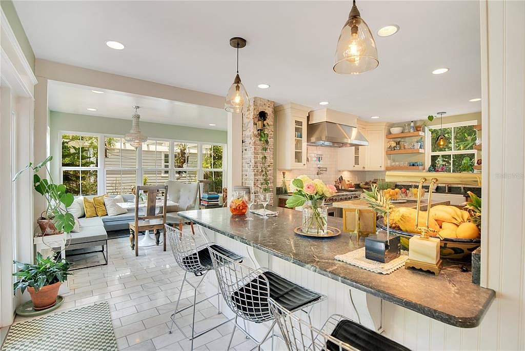A bright and open kitchen seamlessly transitions into a sunny breakfast nook, perfect for family gatherings and casual meals. The kitchen features a large, dark granite island with wire-frame stools, pendant lighting, and fresh flowers for a welcoming touch. White cabinetry, stainless steel range hood, and exposed brick detail add to the inviting atmosphere. Open shelving and big windows let in plenty of natural light, enhancing the pleasant ambiance. The breakfast nook is lined with cozy benches and colorful pillows, set beside large windows, making it ideal for children or group seating. Soft green accents and potted plants enrich the cheerful, family-friendly vibe.