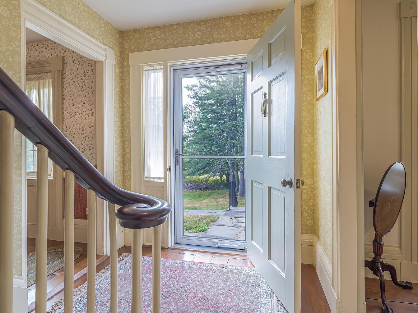 Bright and welcoming, the entryway features soft yellow floral wallpaper that complements the natural light streaming in through a large, partially open door. A curved wooden banister leads to a staircase, enhancing the classic architecture. Rich wooden flooring is partially covered by an intricate rug, adding a cozy element. To the right, an antique table with round mirror provides a charming focal point. The door opens to a scenic view of the outdoors, framed by slender windows dressed with light curtains, creating a harmonious connection between interior and exterior spaces while inviting guests into this historic home.
