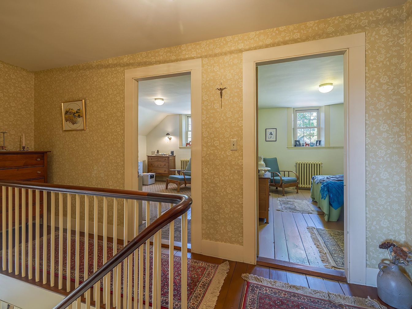 A charming upstairs hallway features soothing floral wallpaper in soft beige, providing a vintage appeal. Two doorways frame distinct rooms; one leads to a cozy bedroom adorned with a blue and green bedspread, a wooden dresser, and a comfortable chair. Natural light streams through a nearby window, highlighting rustic wood floors. The other doorway opens to a space with a desk and warm, inviting decor. A wooden banister with a gracefully curved top rail enhances the inviting ambiance, while a traditional rug adds warmth and color to the hallway, perfectly complementing its historic character.