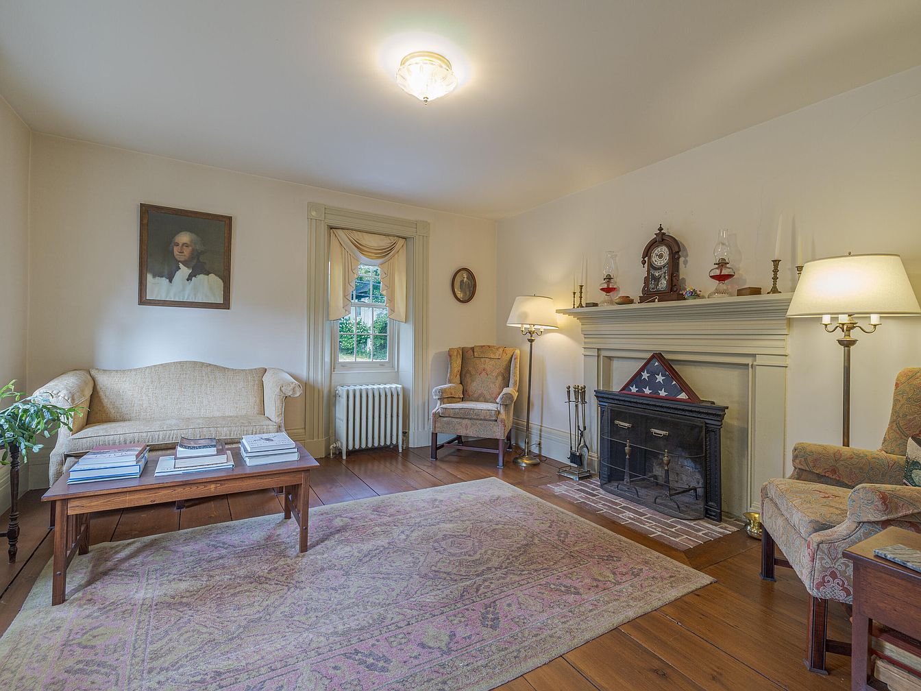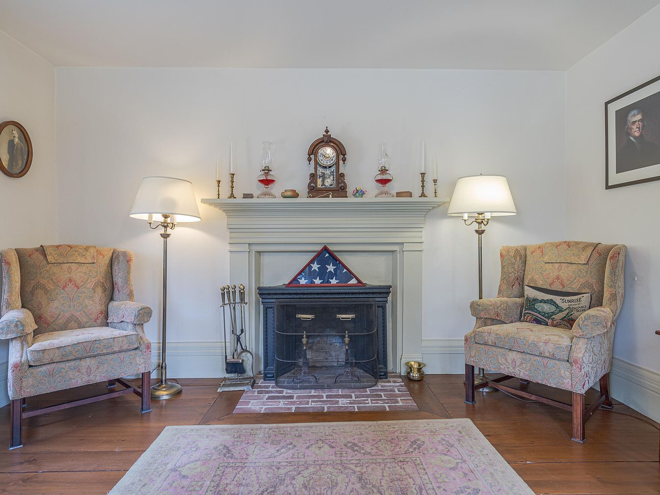 A cozy living room features two elegant wingback chairs upholstered in a subtle floral pattern. Between them stands a vintage floor lamp, casting a warm glow. The fireplace, set against a light-colored wall, is adorned with an array of decorative items, including oil lamps and candlesticks. A flag display rests on the mantel, adding a historical touch. The brick hearth is framed by polished wooden flooring that complements the soft hues of the room. A delicate area rug adds comfort underfoot, while framed portraits and a painted image contribute to the room’s charming, nostalgic atmosphere.