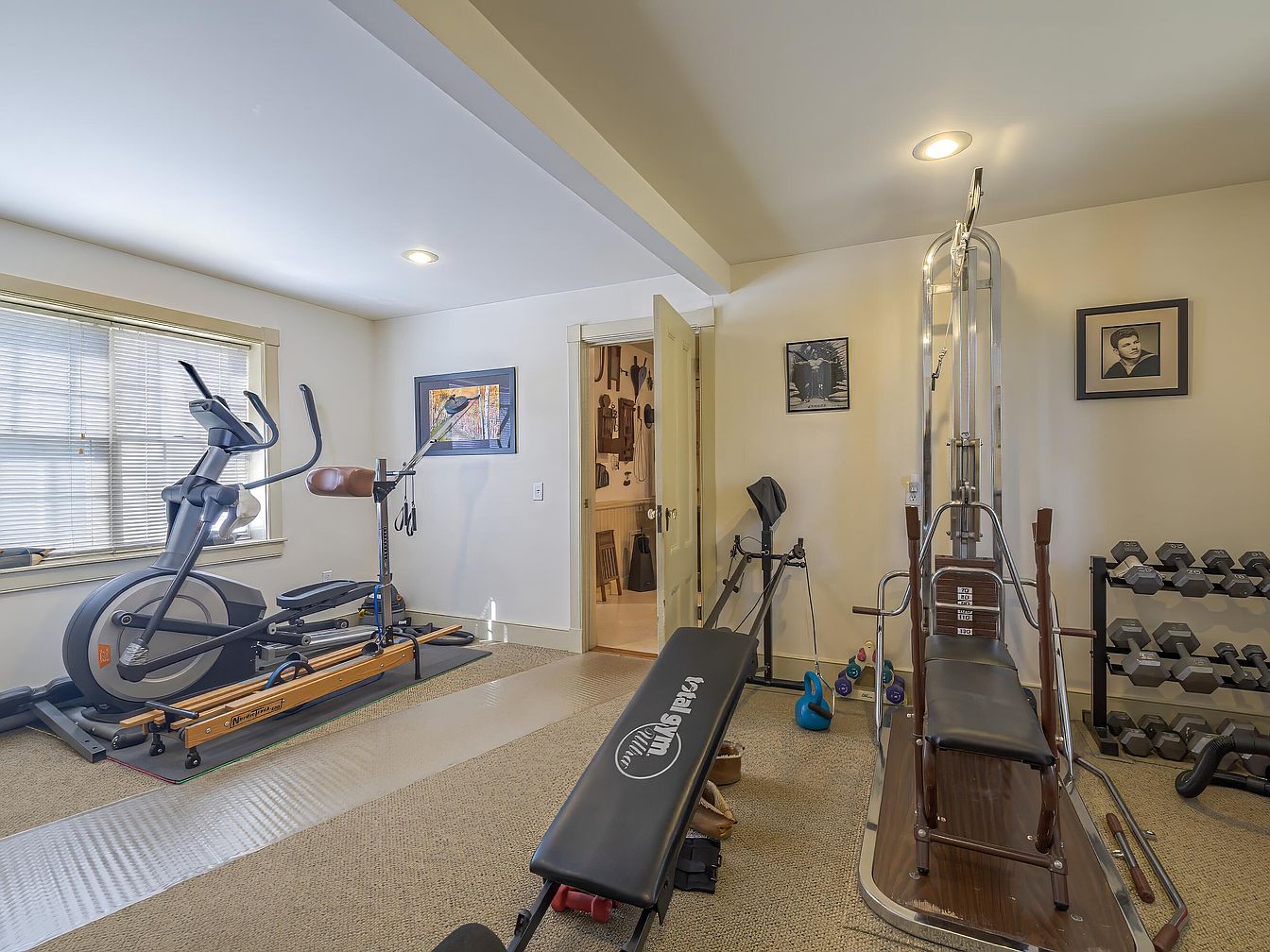 This home gym features a spacious layout with natural light filtering through large windows adorned with blinds. The walls are painted a soft, neutral color, enhancing the serene atmosphere. Equipment includes an elliptical machine, a weight bench, a cable machine, and free weights neatly stored on a rack, demonstrating a focus on fitness. The floor is carpeted, offering comfort underfoot, while a clear mat protects the area beneath the machines. Personal touches like framed artwork and photos on the walls provide an intimate and motivating environment. Overall, this space fosters both functionality and style.