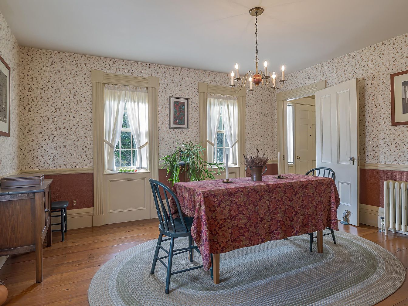 A cozy dining room featuring a round table draped in a rich maroon floral tablecloth. Surrounding the table are black spindle-back chairs, creating a charming contrast. The walls are adorned with delicate floral wallpaper, complemented by a deep red wainscoting. Natural light floods in through two large windows, adorned with sheer white curtains, highlighting the space. A rustic chandelier hangs from the ceiling, its warm glow accentuating the wooden floorboards. Architectural details include framed artwork and a vintage sideboard, adding character. A potted plant by the window brings a touch of greenery, enhancing the inviting atmosphere.