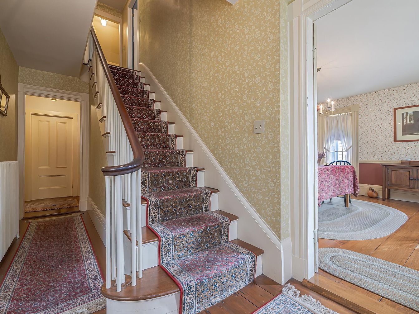 This entryway features a classic staircase with ornate, patterned carpet that guides the ascent. The walls are adorned with soft, floral wallpaper in a pale yellow hue, creating a warm and inviting atmosphere. A subtle wainscoting is present along the lower section of the wall, adding texture and depth. To one side, a radiator is nestled against the wall, maintaining a cozy environment. An area rug runs along the wooden floor, complementing the rich tones of the woodwork. A glimpse into an adjacent room reveals hints of bright curtains and a charming dining setup, enhancing the space’s homey feel.