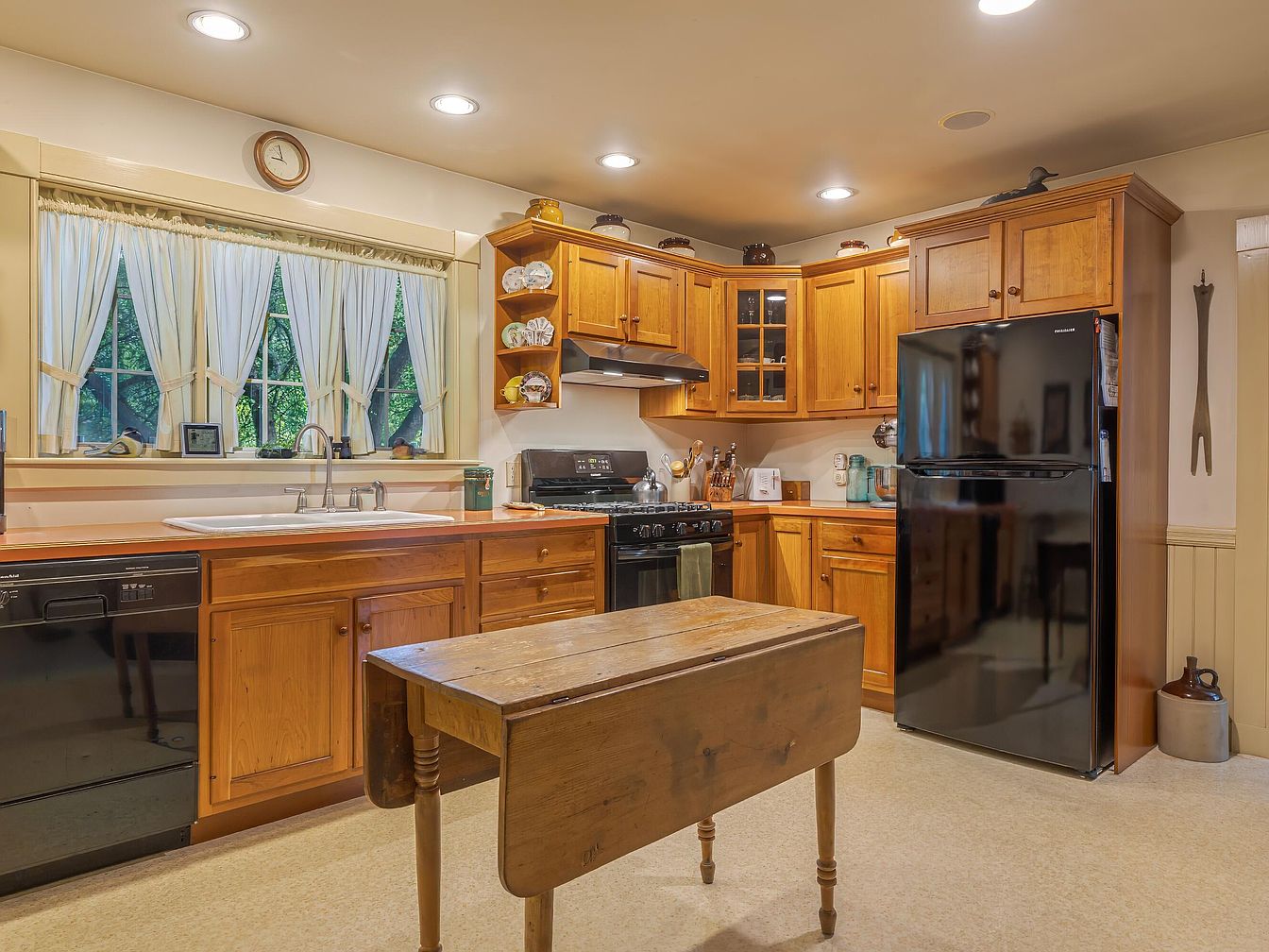 This cozy kitchen features a warm, inviting aesthetic with wooden cabinetry offering a natural finish. It has an open layout, highlighted by a charming farmhouse sink beneath large, sheer-curtained windows that let in ample natural light. The countertops are a rich wood with a rustic feel, accommodating practical appliances such as a black dishwasher and a stove. A small, vintage table stands in the center, providing a functional workspace. The color scheme combines earthy tones with hints of cream, harmonizing with decorative elements like shelves displaying pottery, creating a homely, lived-in ambiance.