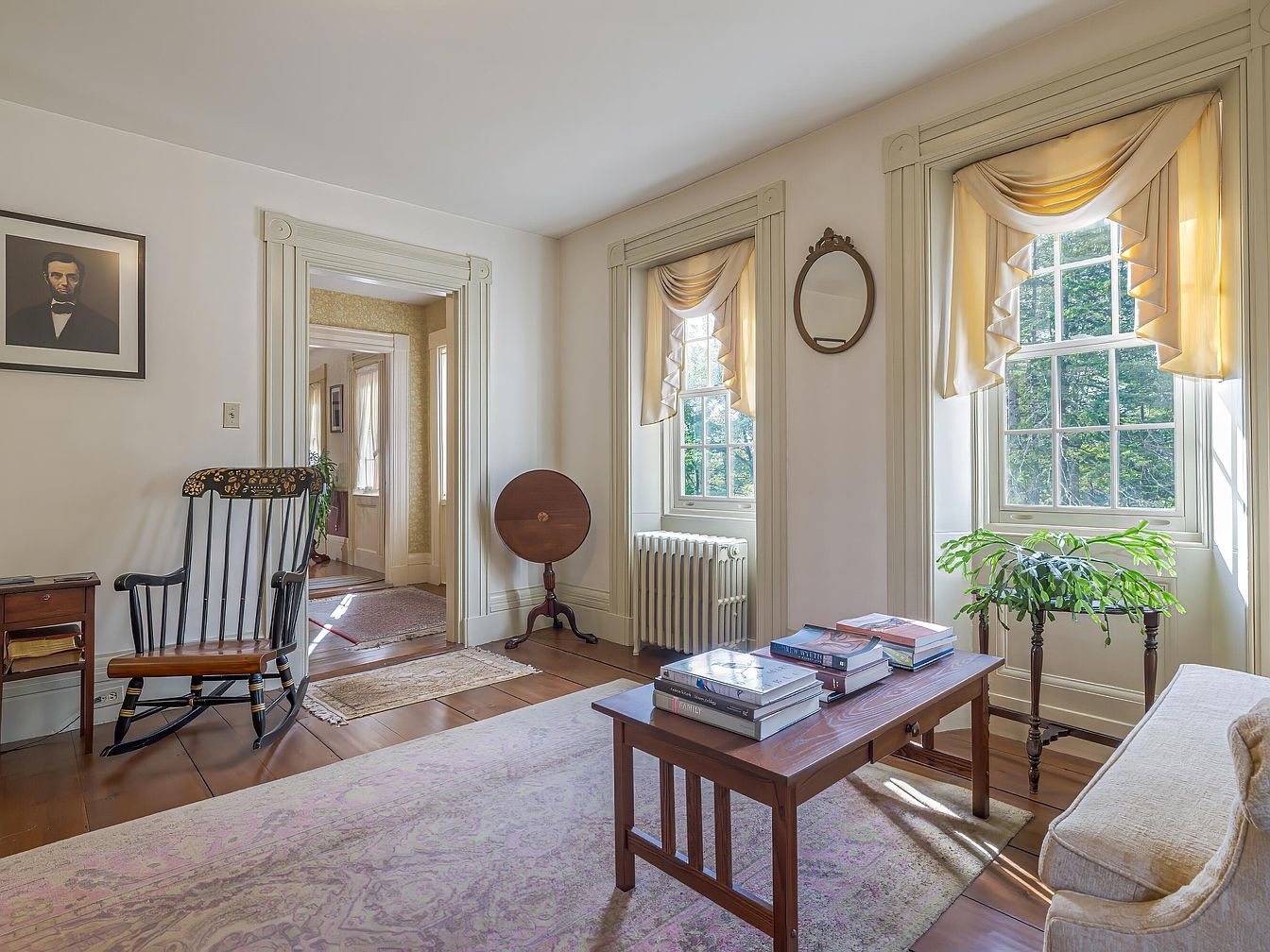 This living room features a warm and inviting layout with soft, natural light streaming through large windows adorned with elegant, draped curtains. The color scheme includes creamy walls and rich wooden flooring, complemented by a light-hued, plush sofa. A vintage rocking chair adds character, paired with a charming wooden coffee table topped with a collection of books. A small plant in the corner brings a touch of nature indoors. Architectural details like the intricate trim around the windows and the vintage mirror on the wall add historical charm, enhancing the room’s cozy yet refined atmosphere.