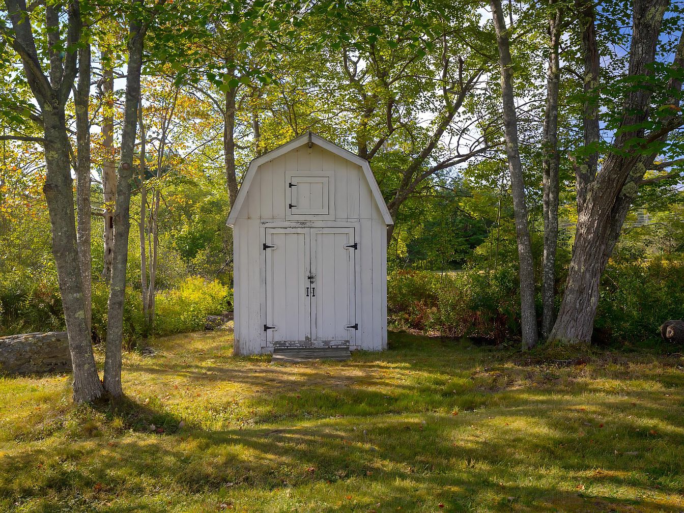 A quaint garden shed stands elegantly in a peaceful outdoor setting. Its classic white wooden facade contrasts beautifully with the surrounding greenery. The shed features a peaked roof and simple double doors, providing a charming rustic appeal. The area is bordered by tall trees, their leaves displaying hints of autumn colors, creating a serene ambiance. The lush, well-kept grass surrounds the shed, enhancing the idyllic scene. Natural light filters through the branches, casting soft shadows. This tranquil garden space is an inviting retreat, perfect for storing tools or enjoying a quiet moment in nature.