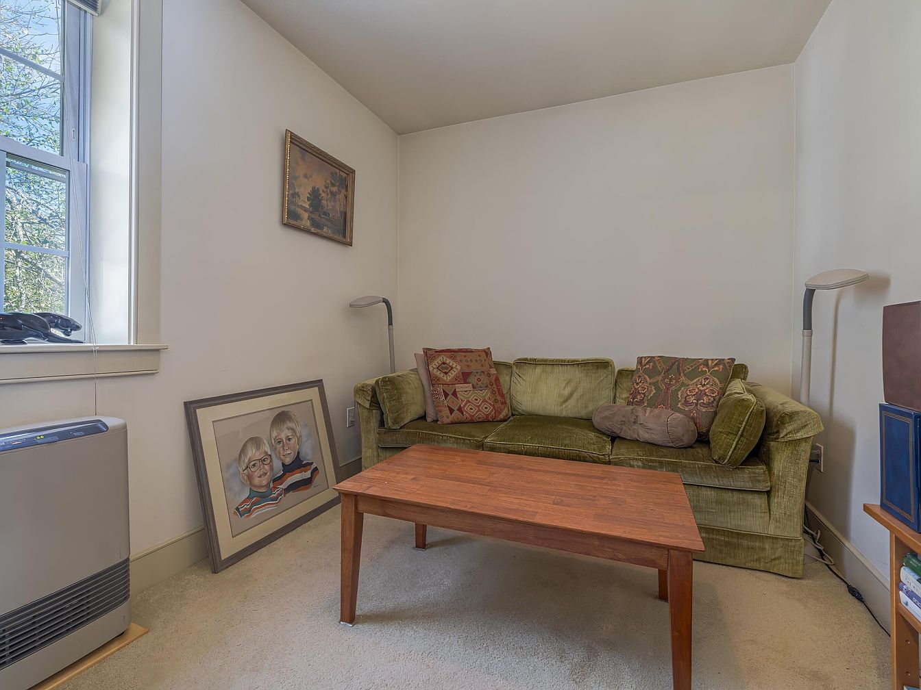 This cozy nook features a plush green velvet sofa adorned with decorative cushions, creating a welcoming atmosphere. A wooden coffee table occupies the center, complementing the soft beige carpet underfoot. Natural light pours in through a large window, highlighting a serene outdoor view. Against the wall, a framed portrait of two children adds a personal touch, enhancing the room’s charm. A sleek floor lamp stands nearby, providing additional lighting. The warm neutral walls create a calming backdrop, while subtle architectural details like crown molding add character, making this space perfect for relaxation or intimate conversations.