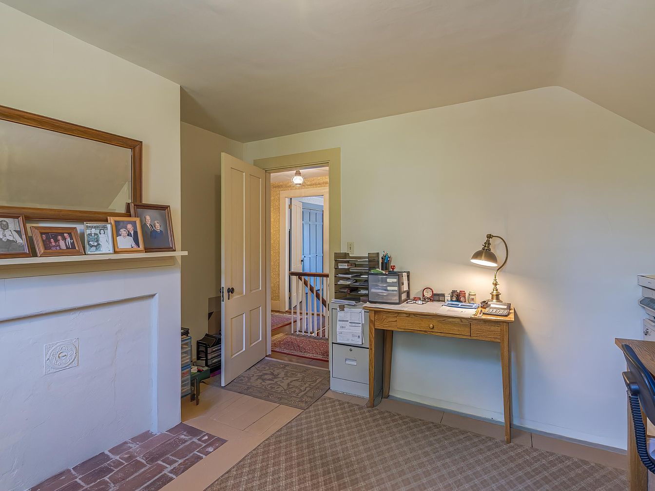 This home office features a cozy layout with a warm, inviting atmosphere. A wooden desk, paired with a classic desk lamp, offers a functional workspace. The wall behind the desk is adorned with framed photographs, adding a personal touch. A fireplace with a decorative motif anchors the room, while the soft, neutral color palette enhances the tranquility. Light floods in from the doorway leading to the staircase, which is lined with a charming railing. The patterned rug beneath the desk complements the subtle textures of the walls and floor, creating a harmonious blend of warmth and practicality.