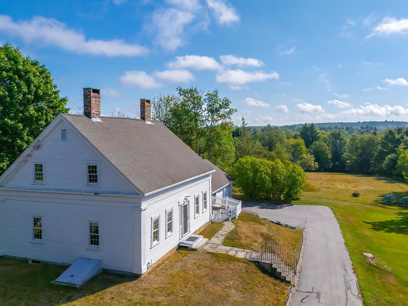 The exterior showcases a classic historic American home, characterized by its white clapboard siding and a gently sloped roof. Two prominent brick chimneys rise from the roofline, hinting at a cozy interior. Large multi-paned windows allow ample natural light, framed by lush greenery. The surrounding yard is expansive, dotted with trees, and a path leads to the entrance adorned with a small staircase. A sloping lawn adds depth to the scene, while the clear blue sky enhances the overall tranquility. The architecture reflects a timeless rustic charm, blending harmoniously with the natural landscape.