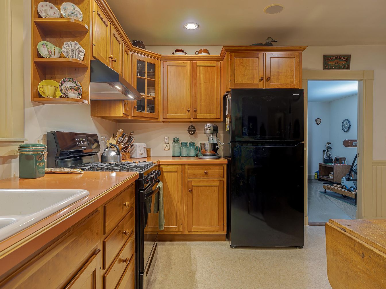 This kitchen features warm, honey-toned wood cabinetry enhancing a rustic charm. It showcases a blend of functional design with aesthetics, including a spacious layout and a subtle, inviting color palette dominated by beige and brown. The stainless-steel appliances contrast nicely with the wooden elements. A sleek countertop provides ample workspace, while shelves display decorative dinnerware, adding personality and warmth. The design incorporates recessed lighting for a cozy ambiance, and the open doorway hints at additional spaces, creating a seamless flow throughout the home. Overall, the kitchen embodies comfort and practicality, ideal for culinary adventures.