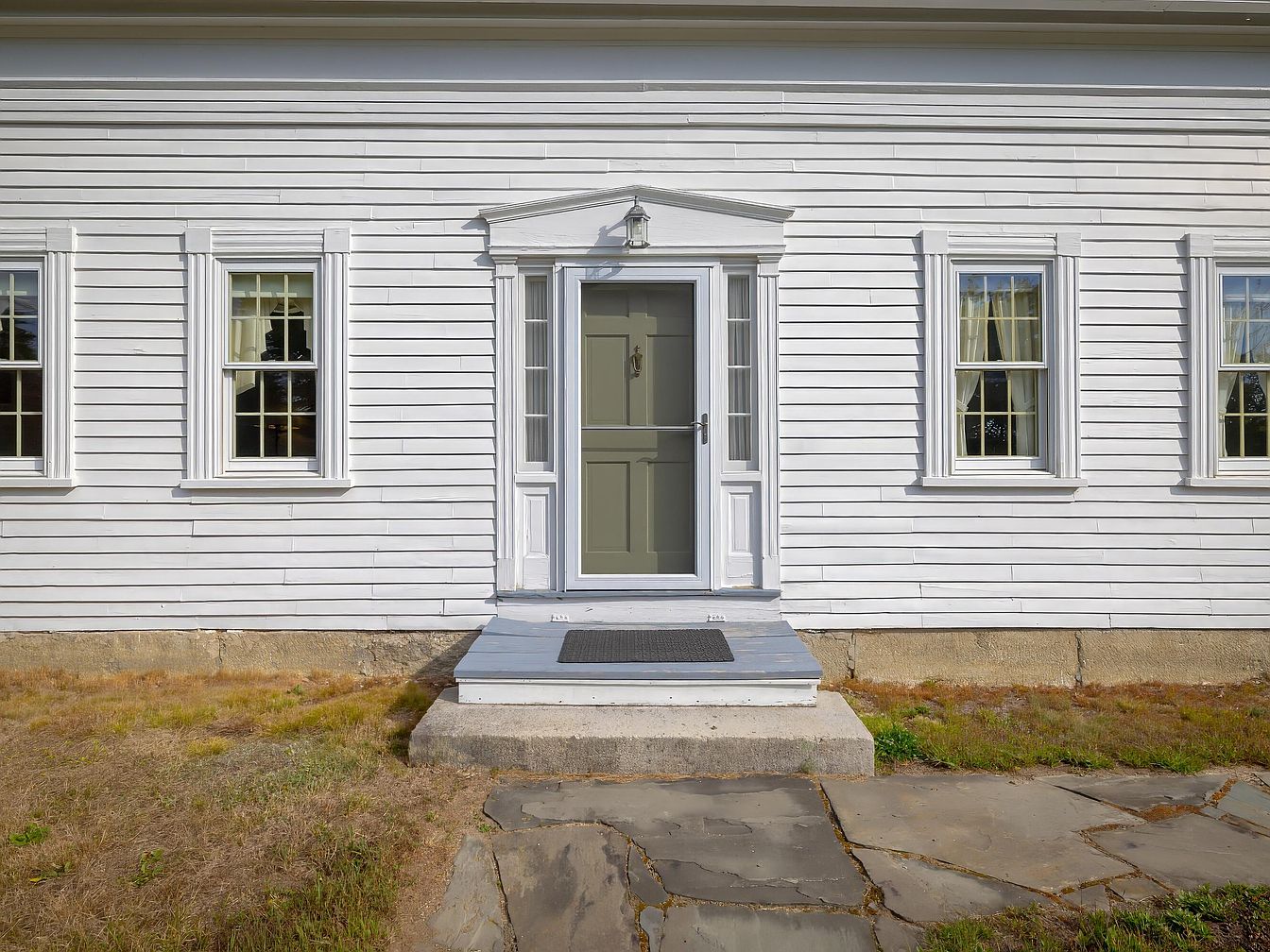 The front entrance features a simple yet charming design, highlighted by a pale gray door flanked by clear glass sidelights that invite natural light. The door is set beneath a small pediment, enhancing the traditional architectural style. Surrounding the entrance are white clapboard siding and decorative trim, providing a clean contrast against the muted door. Two neatly arranged windows with white curtains offer grace and openness, enhancing the home’s inviting aura. The concrete steps leading up to the door are framed by a stone pathway, creating a functional yet appealing entryway. Lush grass and patches of wildflowers add vibrancy to the setting.