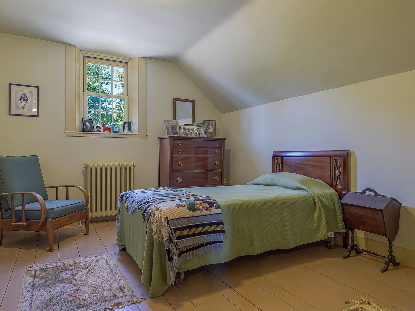 This cozy bedroom features a gently sloping ceiling, enhancing its intimate ambiance. The walls are painted a soft beige, creating a warm backdrop. A wooden bed with an embossed headboard includes a muted green coverlet, inviting relaxation. Adjacent, a dark-stained dresser showcases personal photographs and decorative accents, surrounded by small framed prints on the wall. A vintage wooden chair with a light blue cushion adds a pop of color, while the radiator provides warmth. The room’s hardwood floor is accentuated by a delicate area rug, contrasting beautifully with the serene color palette and overall vintage charm.