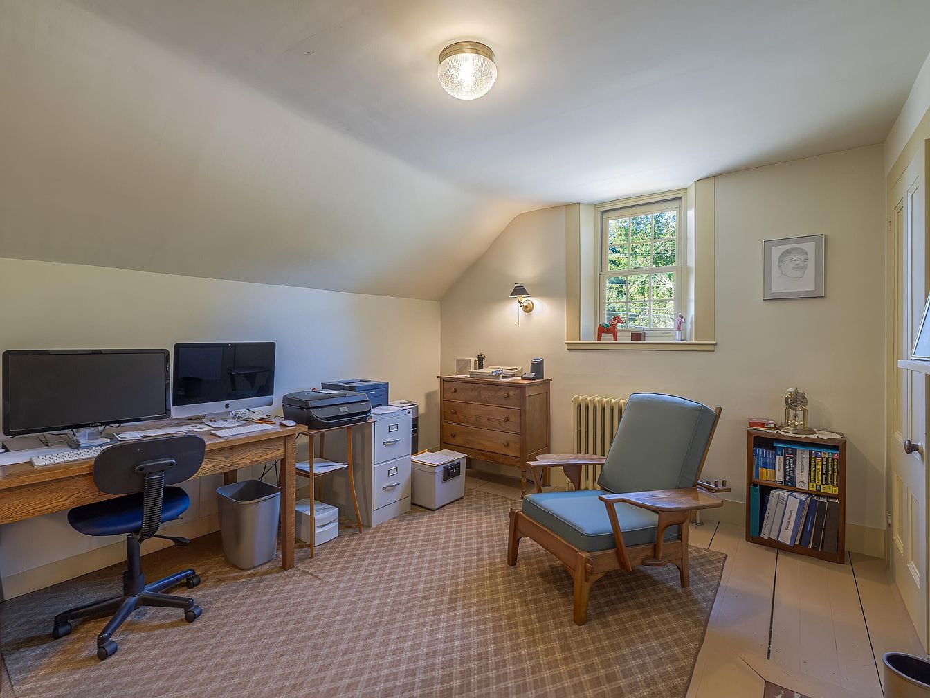 A cozy home office situated under a sloped ceiling, features a serene color palette of soft beige walls. Two large monitors are positioned on a wooden desk, accompanied by a comfortable ergonomic chair. The desk is neatly arranged with scattered papers, a printer, and a waste bin. A wooden chest of drawers adds warmth, complemented by a small bookshelf filled with books. Natural light enters through a window adorned with greenery outside, while a wall-mounted light fixture offers additional illumination. The flooring is a light wood finish, enhancing the room’s inviting atmosphere, ideal for productivity.