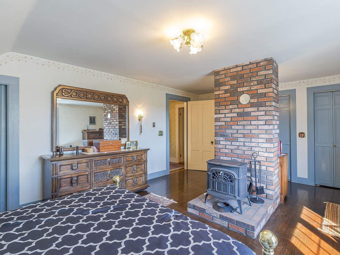 A cozy bedroom featuring a charming mix of traditional and vintage elements. The focal point is a dark wood dresser with intricate carvings, complemented by a large mirror that enhances the room’s light. A black and white patterned bedspread adorns the bed, contrasting with the warm wooden floor. The room’s walls are painted a soft hue, accompanied by floral wallpaper trim, adding a subtle touch of elegance. A distinctive brick chimney stands centrally, adding character, while an ornate light fixture hangs above, casting a warm glow. Light blue doors lead to storage, balancing the space’s aesthetic.