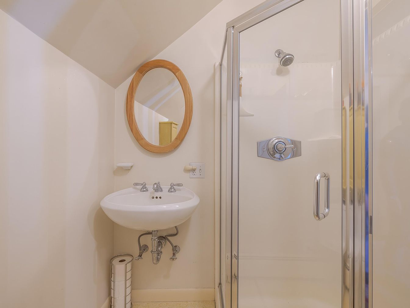 The space features a compact bathroom corner with a sloped ceiling, maximizing utility in limited space. A circular wooden-framed mirror above a stylish pedestal sink reflects natural light, enhancing the bright, clean atmosphere. The sink is equipped with polished chrome faucets, adding a modern touch. Adjacent, a glass shower enclosure with chrome fixtures offers a sleek contrast, showcasing contemporary design. Soft beige walls create a warm backdrop complemented by light-colored flooring. A white paper roll holder provides convenience. Overall, the bathroom balances modern aesthetics with functionality, fitting seamlessly into the historic charm of the home.