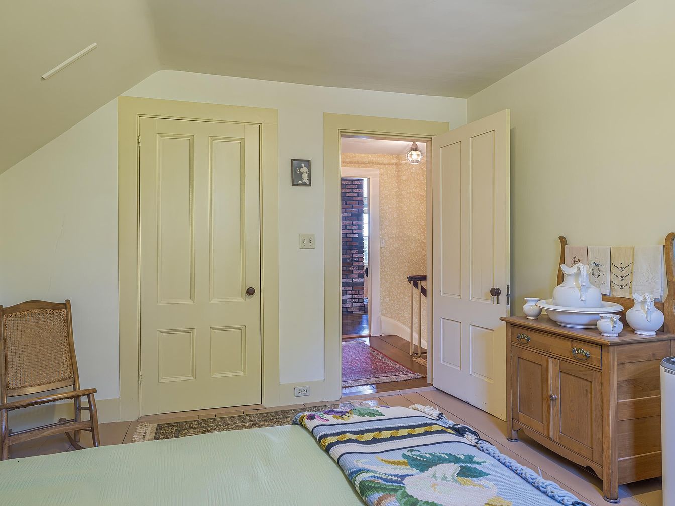 This cozy bedroom features soft, pastel yellow walls that create a warm atmosphere. A vintage bed is dressed with a patterned throw, and a wooden, woven chair sits adjacent, adding a rustic charm. The room has two paneled doors, one leading to a small hallway with visible brick patterned wallpaper, enhancing the historic character. A wooden dresser with porcelain washbasins atop showcases vintage charm, while a delicate framed photo hangs nearby, enhancing personalization. The light hardwood floors add warmth, and a faintly visible area rug provides a soft contrast, harmonizing the overall aesthetic of this charming space.