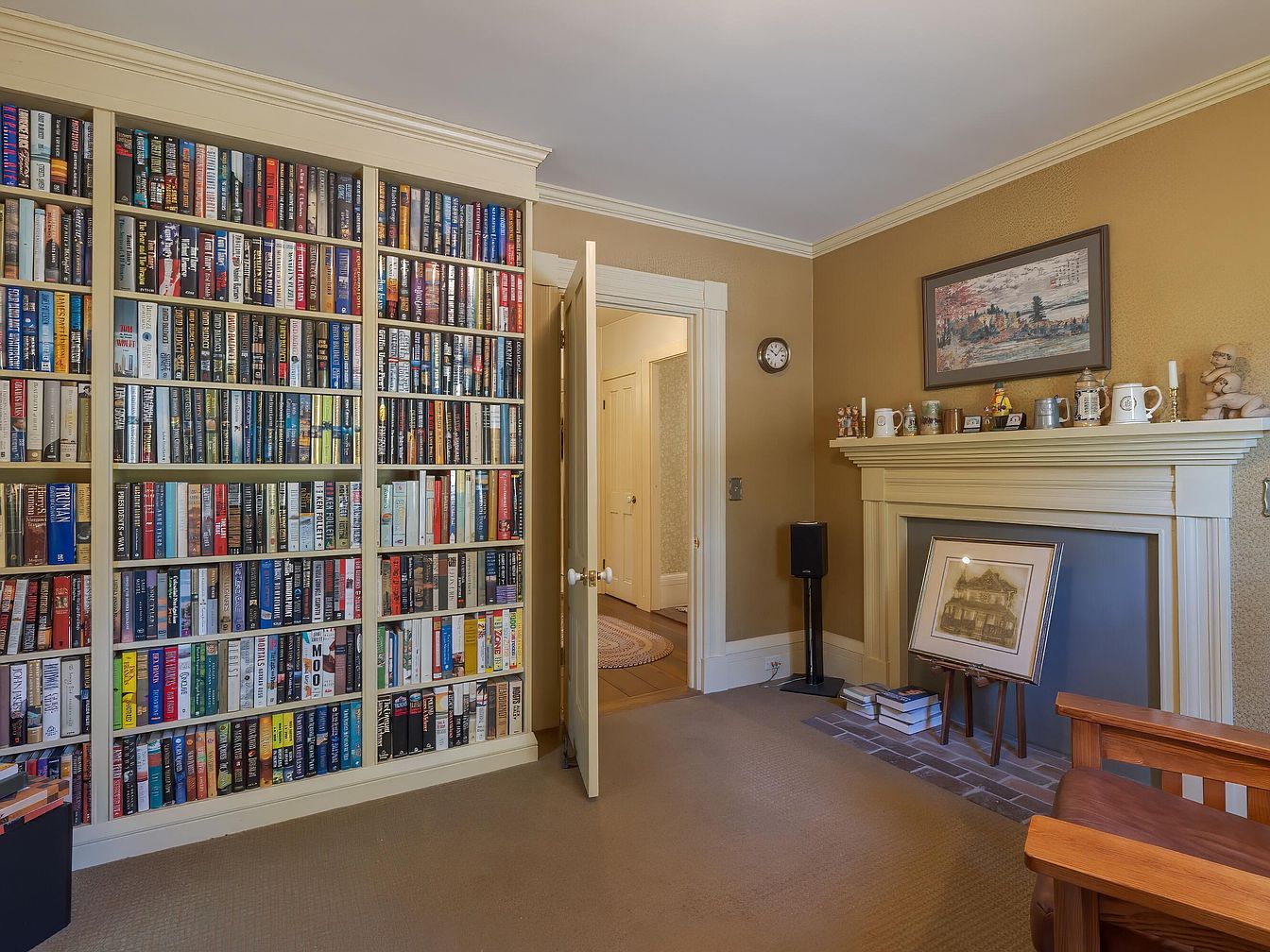 A cozy library space is illuminated by soft, warm light. The focal point is a tall, meticulously organized bookshelf filled with various books, showcasing a spectrum of colors from vibrant reds to deep blues. A fireplace, adorned with a classic mantel, adds a touch of elegance, topped with decorative items and a framed artwork that enhances the room’s character. A plush armchair invites relaxation, positioned next to a subtle speaker. The light beige walls harmonize with the earthy tones of the carpet, creating a serene, inviting atmosphere perfect for reading or contemplation.