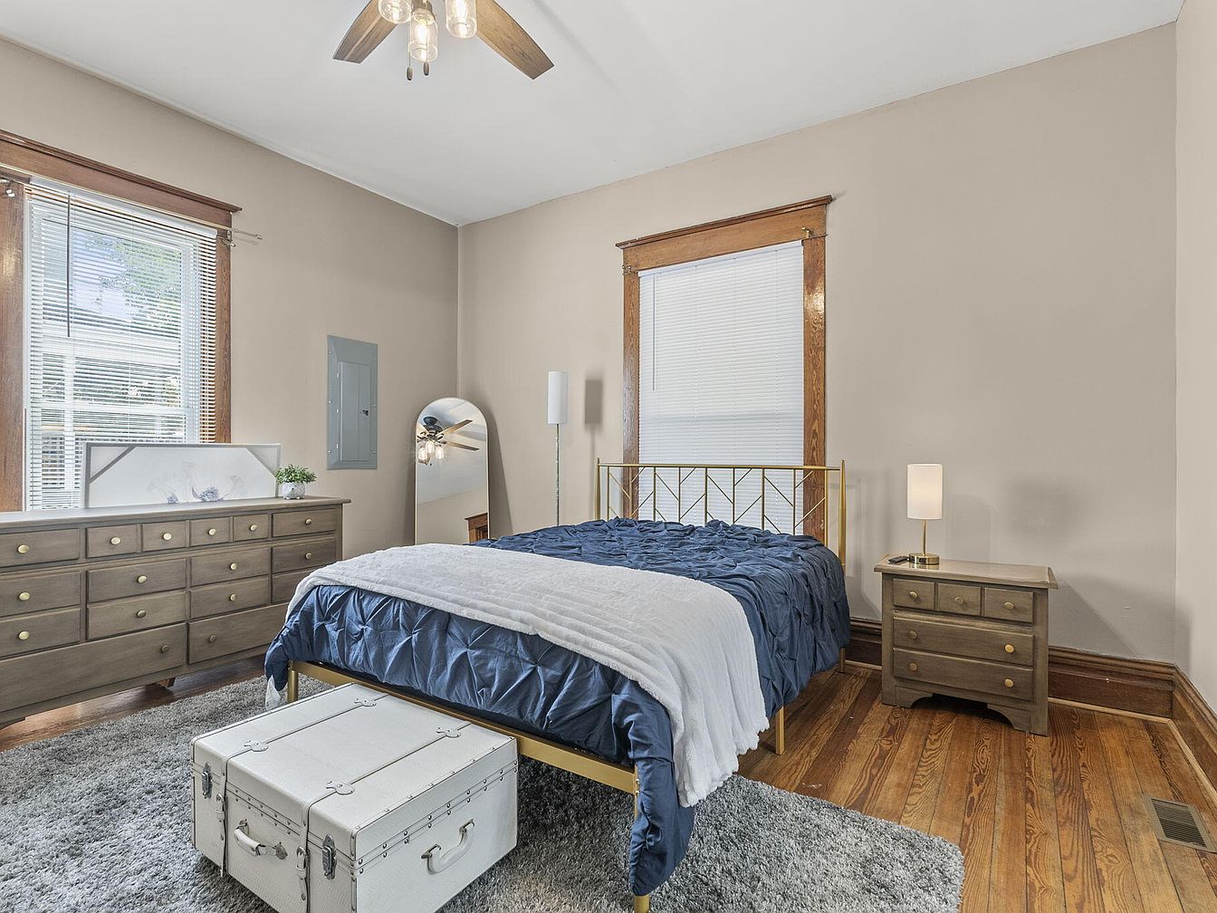 This cozy bedroom features a soothing palette of warm beige walls paired with polished wooden trim. A striking gold bed frame is centered with plush bedding in deep blue, complemented by a soft white throw blanket. To the side, a minimalist wooden dresser and nightstand offer storage, their knobs gleaming faintly. A plush gray carpet underfoot adds comfort, while large windows allow natural light to spill in, softly illuminating the room. A tall standing lamp and a sleek mirror add modern accents, while a vintage-style trunk serves as both a functional and decorative piece at the foot of the bed.