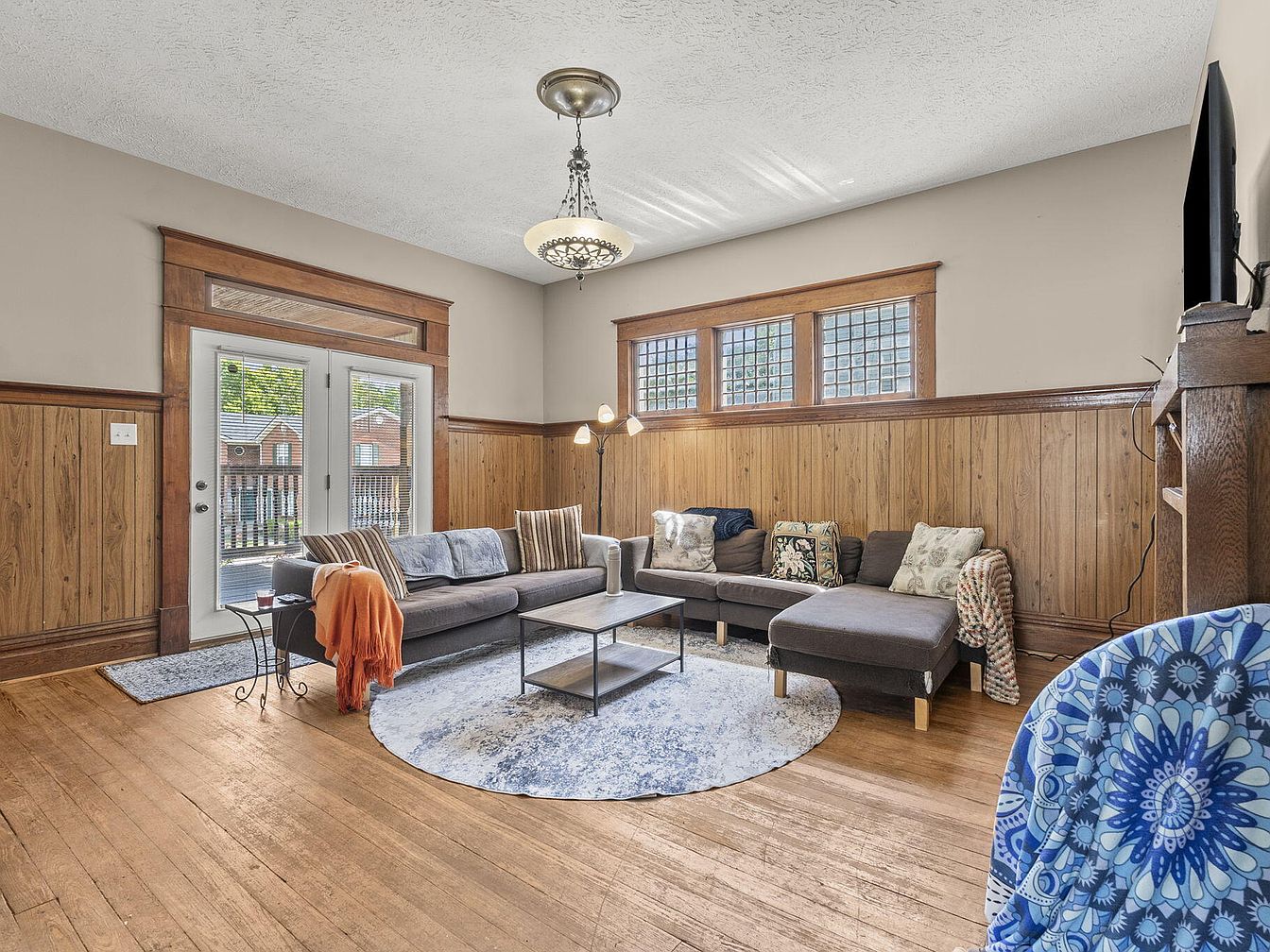 This inviting living room features a blend of modern comfort and historic charm. The walls are adorned with rich wooden paneling, contrasting a soft beige upper section. A spacious gray sectional sofa, accented with colorful throw pillows, invites relaxation, while a vibrant orange throw adds a pop of color. A round area rug with a blue pattern anchors the seating arrangement, complemented by a sleek black coffee table. Large windows allow natural light to fill the space, and decorative glass panes provide privacy. Elegant light fixtures, including a vintage chandelier, enhance the room’s aesthetic appeal.