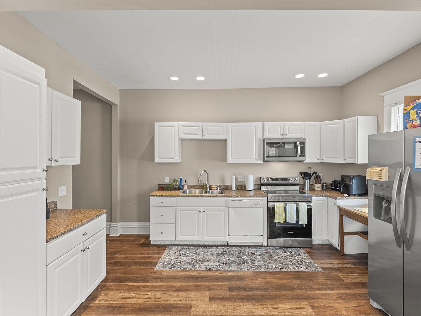 The kitchen features a contemporary layout with a blend of modern and classic elements. White cabinetry contrasts against a warm, wooden floor. A granite countertop extends across the space, providing ample surface area for food preparation. Stainless steel appliances, including a refrigerator and oven, add a sleek appearance. Natural light floods through a window, illuminating the beige walls, giving an inviting feel. A small rug enhances comfort while defining the work area. An open entryway leads to another part of the home, fostering an airy ambiance, while organized utensils and cookware suggest functionality in this well-appointed kitchen.