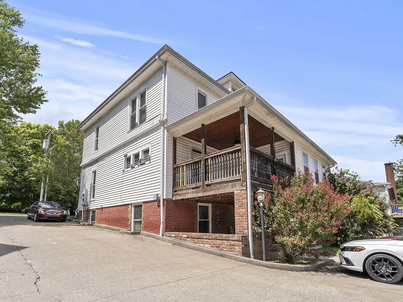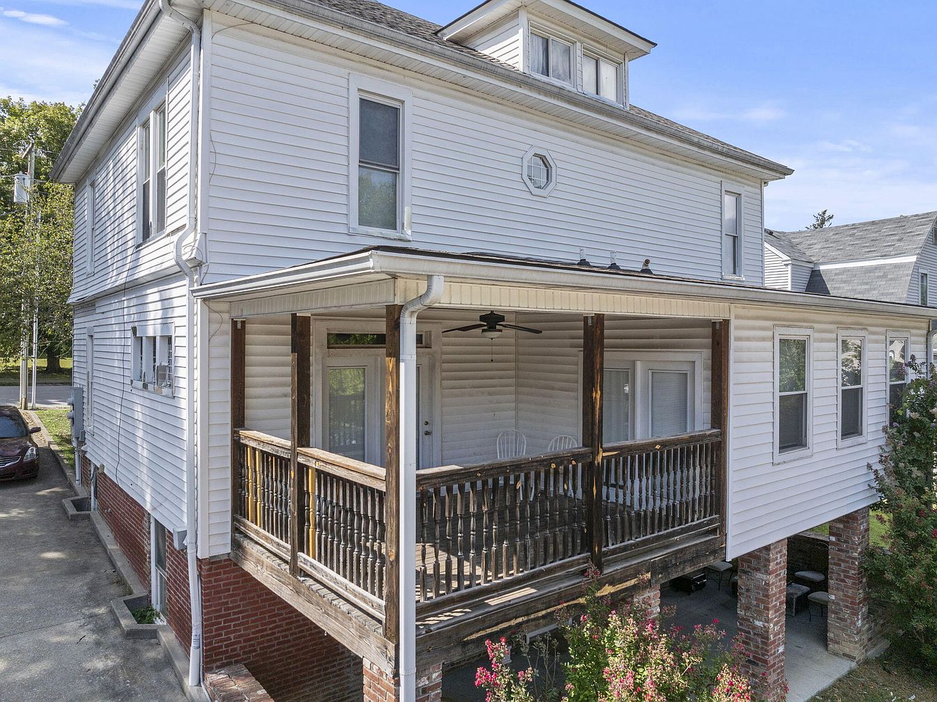A charming exterior of a historic American home showcases a blend of traditional and modern elements. The facade features white vinyl siding complemented by red brick accents at the base, seamlessly merging with the surrounding landscape. A spacious porch, supported by wooden columns, invites relaxation, equipped with a railing that offers a classic touch. Lush greenery, including flowering bushes, enhances the aesthetic, providing color and vibrancy. Driveway access leads to parked vehicles, emphasizing practicality. The overall layout highlights both functionality and character, with architectural details that reflect the heritage of the home, set against a clear blue sky.