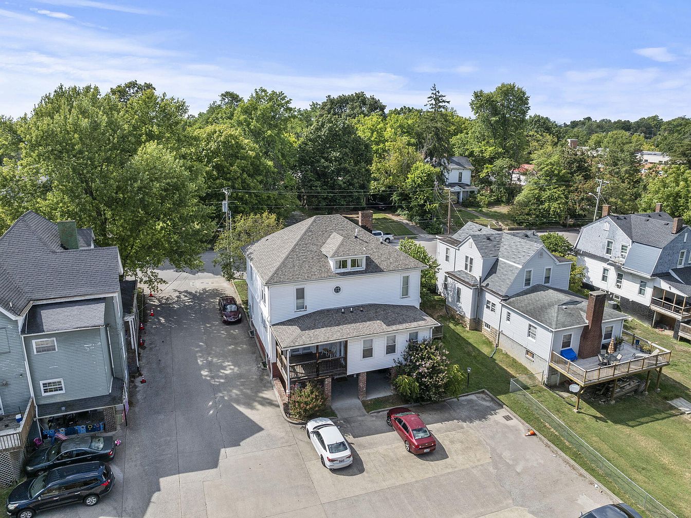 An aerial perspective reveals a historic American neighborhood with various properties showcasing distinctive architectural styles. Prominent is a two-story white house with a gabled roof, displaying large windows and classic porch details. Surrounding homes exhibit varied colors and designs, notably a green structure with a front porch. The layout suggests a mix of residential spaces, interspersed with greenery, and a combination of parked cars on paved areas below. Lush trees provide a natural backdrop, enhancing the suburban feel, while the roadways create a network connecting the houses, indicative of a cohesive community atmosphere.