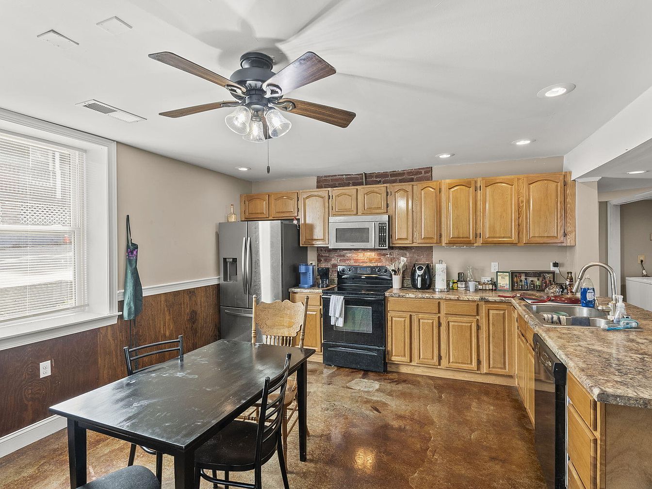 A spacious kitchen area features warm wood cabinetry with classic, curved detailing. The counters are adorned with a rich, speckled granite, complementing the darker tones of the flooring. A large stainless steel refrigerator and microwave sit against the wall, flanked by a black oven range. Natural light pours in through a large window, highlighting the soft beige walls, which harmonize with the deep, dark wood paneling below. A simple black dining table, surrounded by contrasting chairs, invites casual dining. A ceiling fan adds functionality, while exposed brick adds a touch of character to this inviting culinary space.