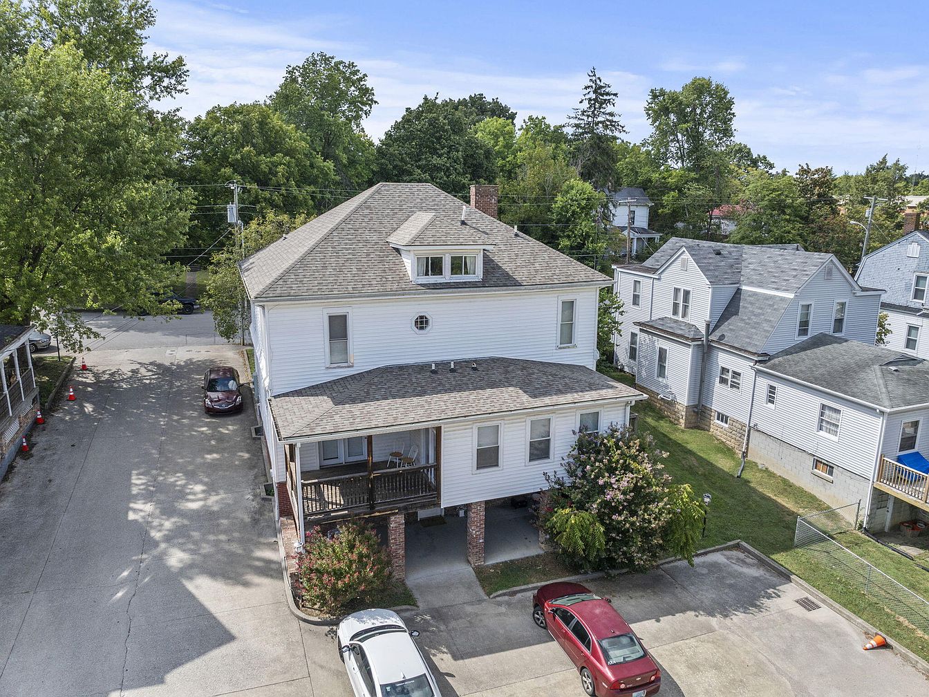 The image captures a historic American home’s exterior, showcasing a multi-story structure with a peaked roof and classic siding painted in white. Front porches, supported by brick columns, add a welcoming touch. The surrounding area features well-kept lawns and a mix of modern and traditional houses, enhancing the neighborhood’s charm. Red and white cars occupy the driveway, while decorative shrubs and trees lend a lush, green backdrop. Architectural details include charming windows and a round attic vent, contributing to the overall aesthetic of timeless elegance coupled with functional design. The scene conveys a sense of community and history.