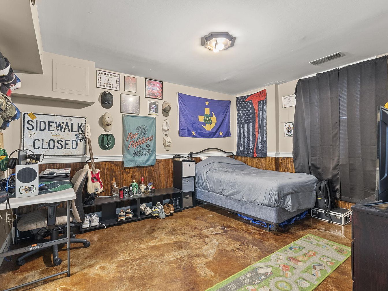 This bedroom features a cozy setup with a mix of personal touches and functional furniture. A neatly made twin bed with gray bedding sits against a wall adorned with various flags and a collection of framed memorabilia. The flooring is a warm, polished concrete that adds an industrial charm. To the left, a modern workspace boasts a simple desk with a computer and a speaker, complemented by a comfortable rolling chair. A small shelf holds assorted items, including drinks and shoes. Black curtains frame the window, allowing for privacy while adding a touch of elegance to the room.