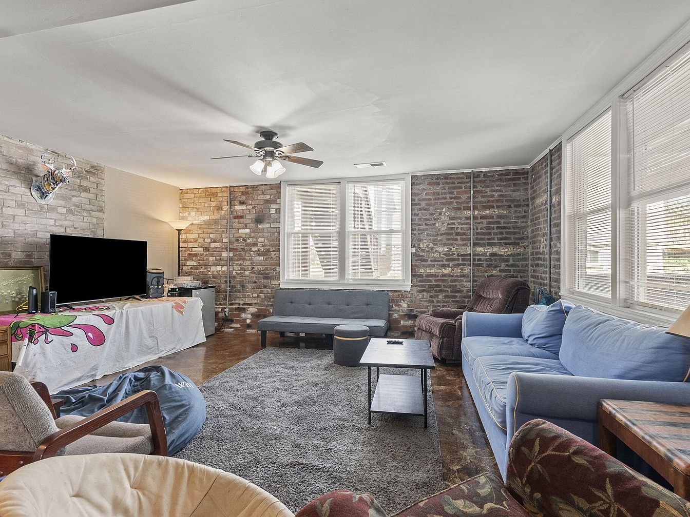 This cozy living room features a blend of modern and rustic elements. Exposed brick walls in warm tones create an inviting backdrop, complemented by a smooth, polished wooden floor that enhances the room’s warmth. A large, plush area rug adds comfort underfoot, while a ceiling fan circulates air. Furniture includes a blue sofa, a sleek gray futon, and various comfortable chairs, including a patterned armchair. A central coffee table ensures functionality amidst the relaxed atmosphere. Natural light pours in through multiple windows, brightening the space and highlighting the casual, laid-back aesthetic prevalent throughout the room.