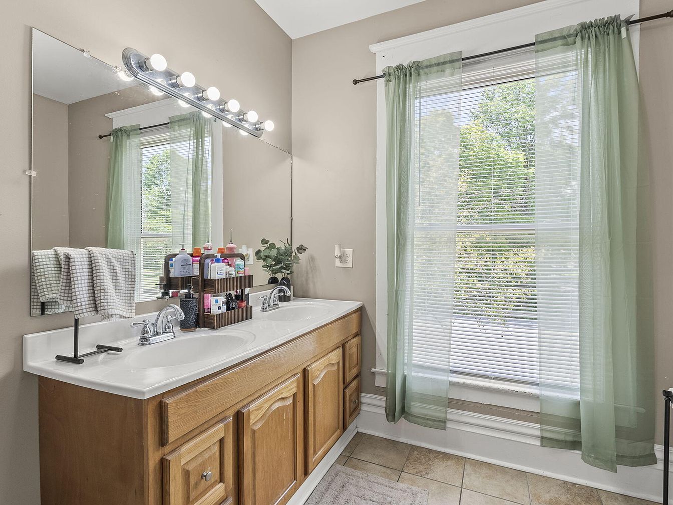 This bathroom features a spacious double vanity with a smooth white countertop and warm wooden cabinetry. Above the sink, a long mirror reflects the natural light streaming in through a large window adorned with sheer green curtains, which softly filters the sunlight. The color palette includes beige walls that create a warm ambiance. A stylish light fixture with multiple bulbs illuminates the vanity, highlighting the various personal care products neatly arranged on a wooden organizer. The floor is tiled in a light cream tone, contributing to an inviting and serene atmosphere, perfect for daily routines.