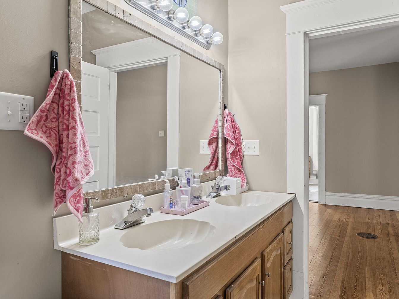 The bathroom features a dual sink vanity with a light-colored surface, showcasing a classic design. Light wood cabinetry contrasts with the simple white counter and chrome faucets. Above, a large mirror, bordered by textured tiling, reflects the soft, neutral wall tones. Three round light fixtures illuminate the space, enhancing its brightness. A pink patterned towel hangs on a black hook, adding a pop of color in an otherwise muted palette. The room has wooden flooring that extends pleasantly into the adjoining area, providing a warm feel to this functional yet inviting space.