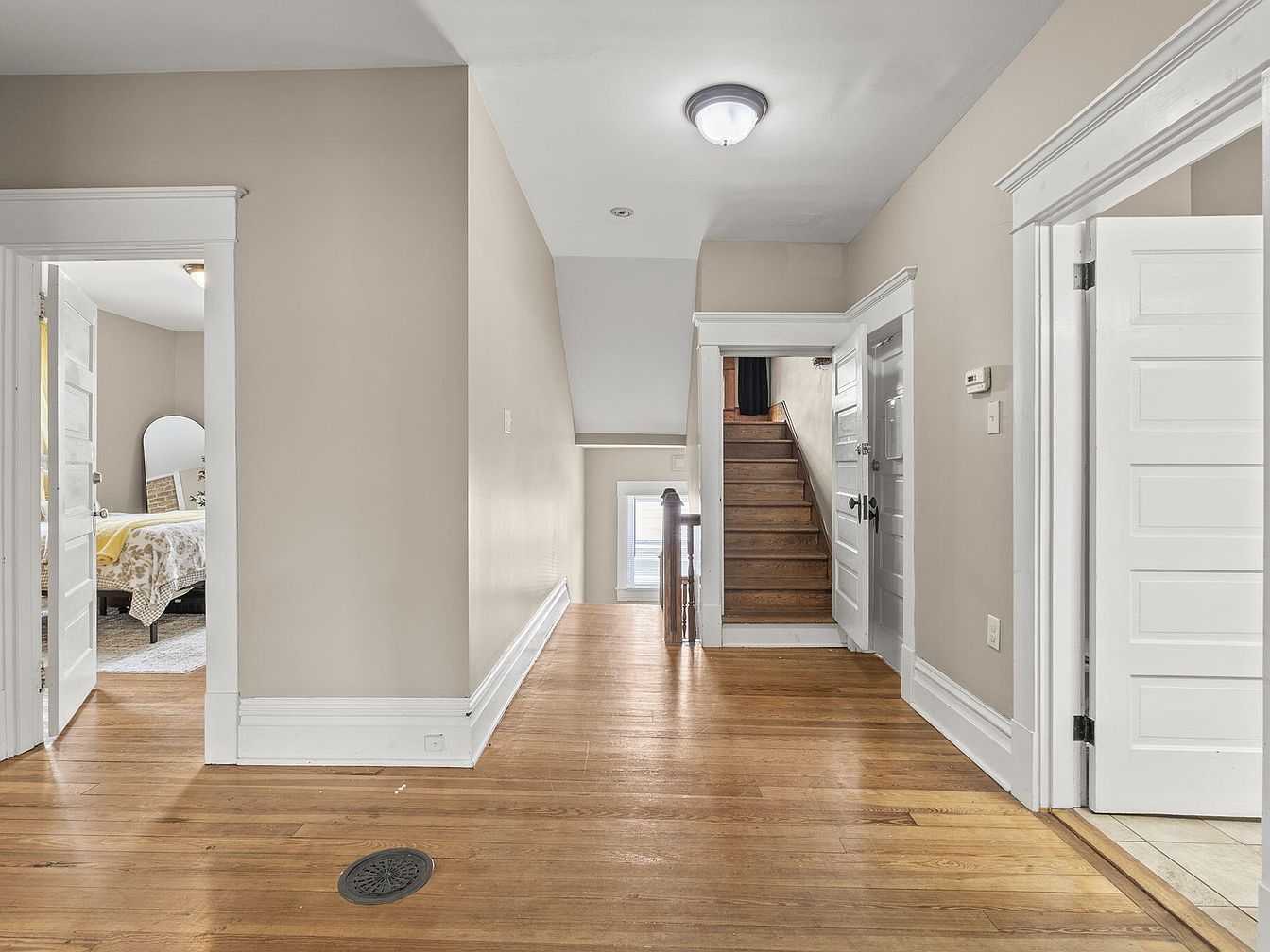 A spacious hallway with rich hardwood flooring stretches ahead, leading to a staircase on the right. The walls are painted a soft beige, providing a warm inviting atmosphere. White trim accentuates the doorways, which are adorned with classic panel doors. To one side, a door reveals a cozy bedroom, partly visible with a yellow bedspread and gray rug, suggesting a modern yet rustic touch. The staircase, featuring natural wood, ascends toward the upper level, while an overhead light fixture illuminates the space softly. Natural light floods in from a window at the end, enhancing the openness of the layout.