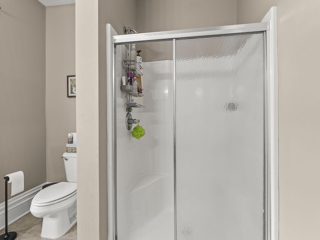 The bathroom features a compact layout with a shower stall and toilet positioned adjacent to each other. The shower is enclosed with frosted glass doors, facilitating privacy while allowing light. Walls painted in a soft beige complement the light-colored tiled floor, creating a warm ambiance. A small framed artwork hangs near the shower, adding a touch of decor. To the left, a sleek toilet rests on an elevated platform, accompanied by a modern toilet paper holder. Shelving is present inside the shower for toiletries, demonstrating a blend of functionality and organization in the design.