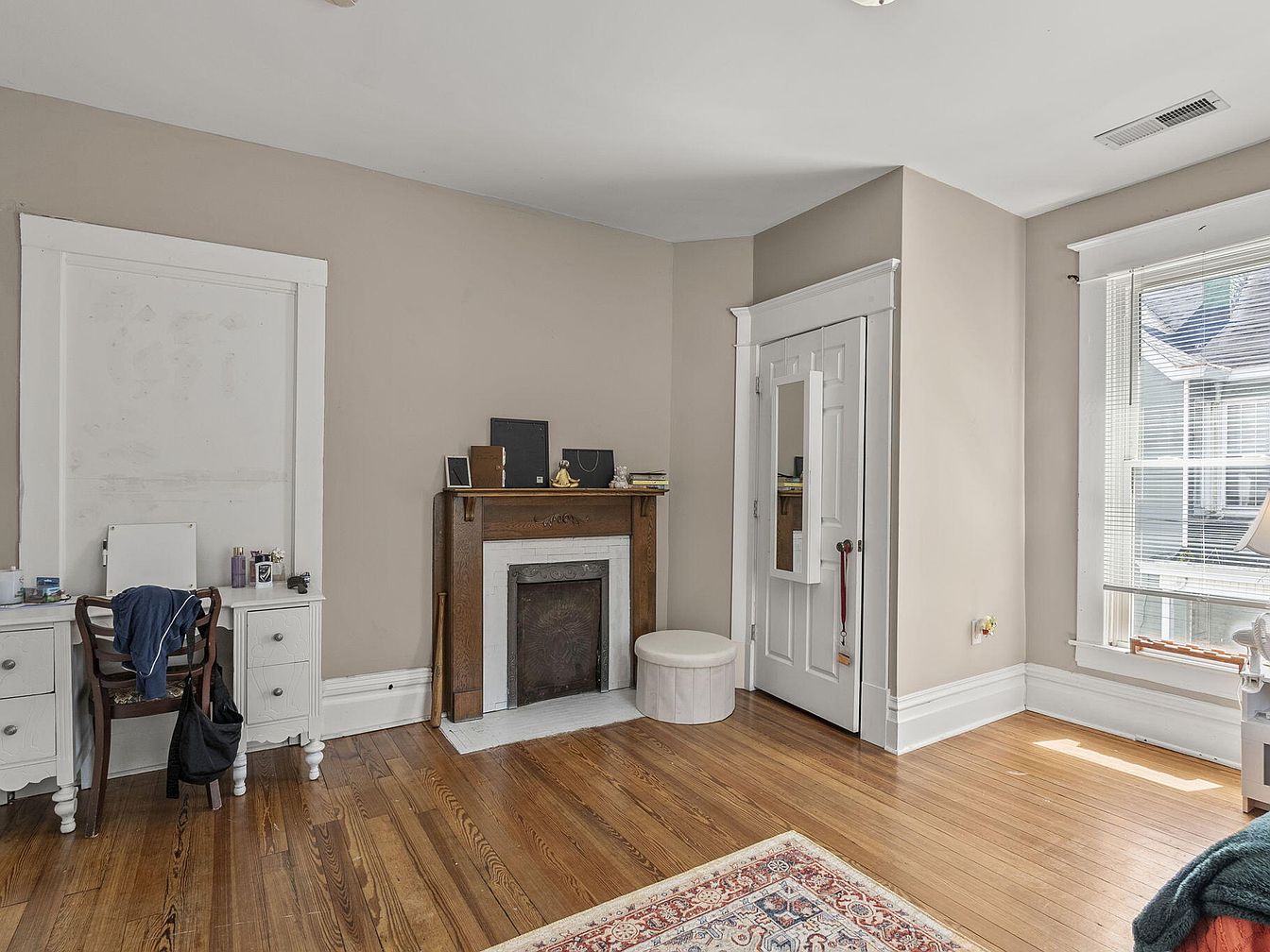 This cozy bedroom features warm wooden flooring that enhances its inviting atmosphere. The walls are painted a neutral beige, creating a soft backdrop for the room’s elements. A classic white mantelpiece with intricate details frames a small fireplace, adding historic charm. Opposite, a pair of white nightstands with decorative knobs flanks a simple chair, while a circular pouf sits nearby for additional seating. Natural light floods in through a large window, highlighting the striped blinds and soft textures within the space. A colorful area rug harmonizes with the muted tones, providing a touch of elegance.