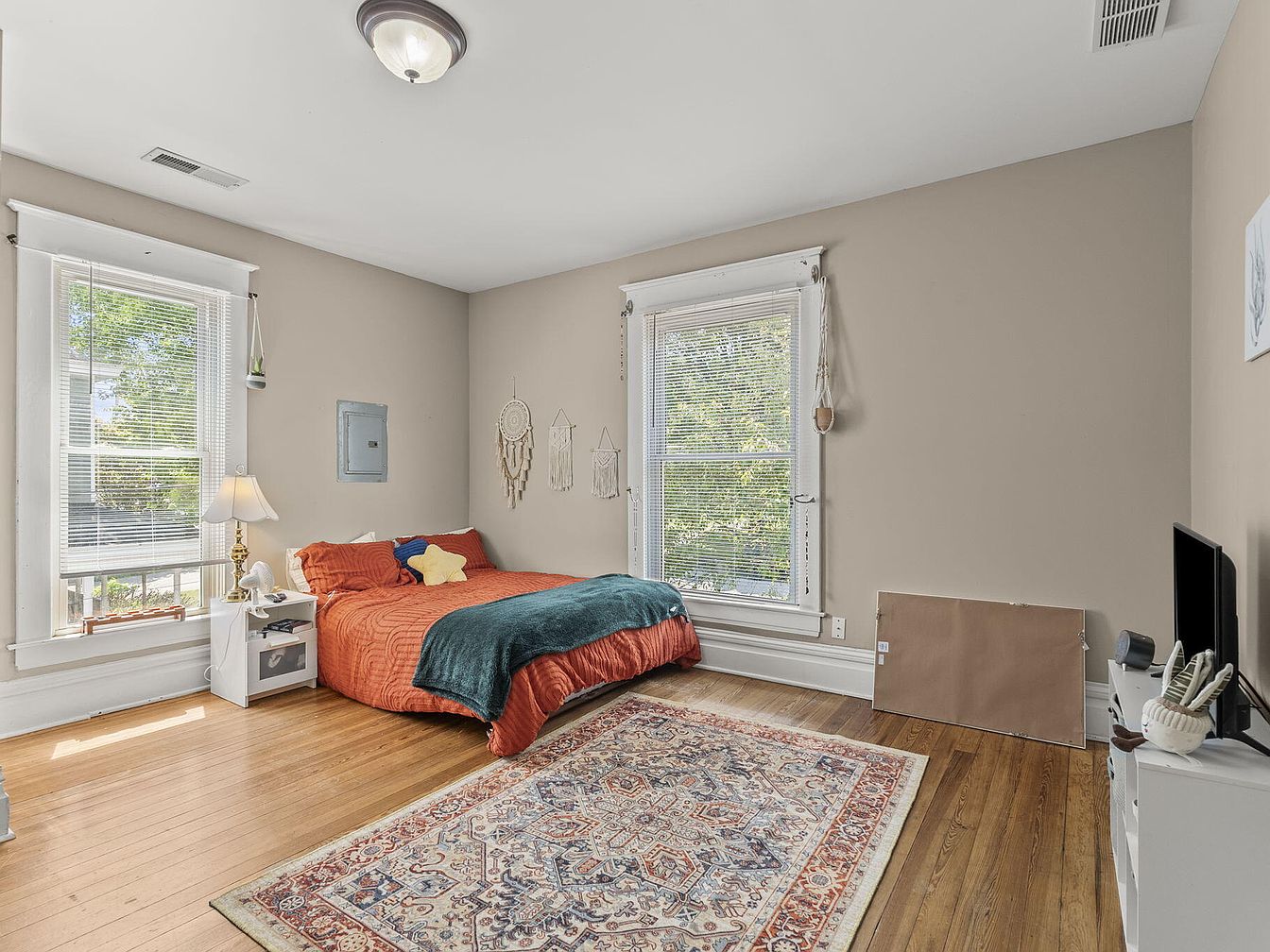 This cozy bedroom features a warm color palette with walls painted a soft beige, enhancing the inviting atmosphere. A large bed, adorned with an orange quilt and a teal throw blanket, occupies the center, accented by a colorful star pillow. Natural light pours in through two wide windows dressed with blinds, illuminating the room. A white bedside table with a lamp offers functional elegance, while a patterned area rug adds texture to the hardwood floor. Wall hangings, including dream catchers, contribute a personal touch, creating a balance of comfort and style in this charming space.