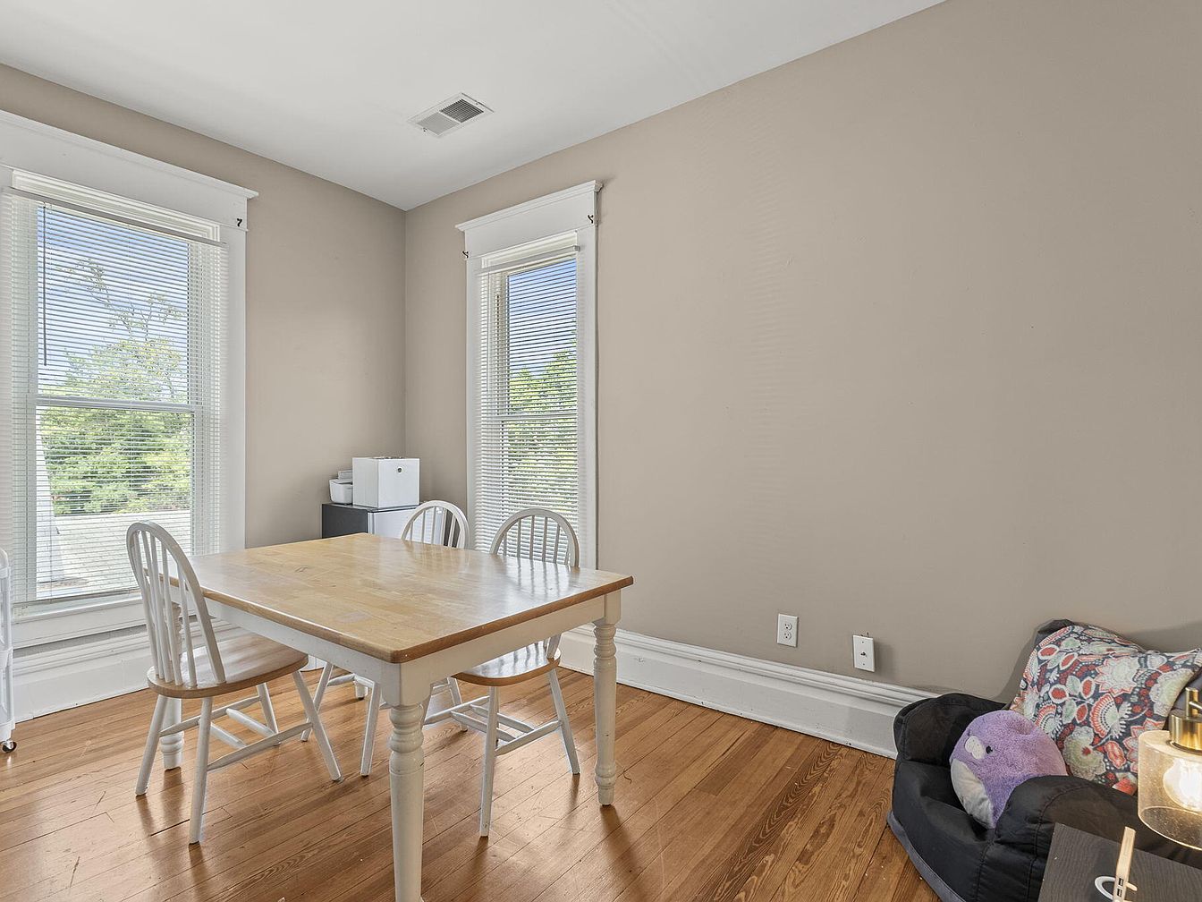This dining room features a light taupe wall color that adds warmth to the space. A central wooden table with a natural finish is surrounded by four white, slatted-back chairs. Two large windows with white blinds allow ample natural light, enhancing the openness. In the corner, there’s a small black storage unit topped with a white box, adding functionality. The hardwood floor showcases a rich grain, complementing the light tones of the furniture. A cozy black armchair, adorned with a colorful patterned pillow, provides an inviting touch, making this area suitable for both dining and relaxation.