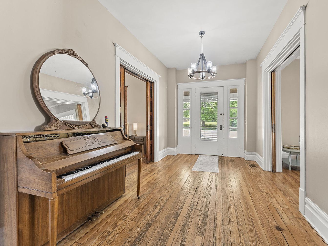 The entryway features rich wooden flooring, enhancing the warm ambiance. A vintage piano sits prominently, adorned with intricate details and a round mirror above it, reflecting the light from a modern, stylish chandelier. The walls are painted in a soft beige, offering a neutral backdrop that complements the natural wood tones. To the right, a spacious doorway with glass panels invites natural light, hinting at the views of the outdoors. Architectural details include classic moldings and tall baseboards that add an air of elegance. A small side table with a lamp completes the inviting atmosphere of the space.