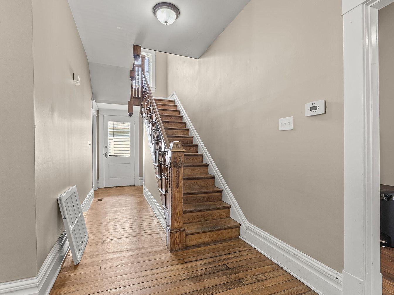 The entryway features a warm wooden staircase leading to the upper floor, showcasing intricately carved balusters and a classic handrail. Soft beige walls create a neutral backdrop, enhancing the sense of spaciousness. Natural light floods through a window near the top of the staircase, illuminating the polished hardwood floor. A white door with multi-pane glass stands prominently, inviting guests into the home. To the side, a small wall-mounted thermostat blends seamlessly with the decor. The overall aesthetic is a blend of vintage charm and functional design, reflecting the character of a historic American home.