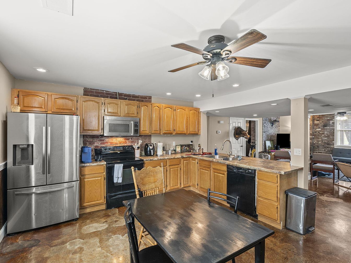A cozy kitchen featuring warm wooden cabinetry with a natural finish contrasts against a dark granite countertop. The layout includes modern stainless steel appliances, including a refrigerator and microwave, enhancing functionality. A rustic brick accent wall adds character, reflecting a blend of contemporary and traditional styles. A spacious dining table crafted from dark wood sits invitingly in the foreground, paired with high-backed chairs. Overhead, a ceiling fan with wooden blades provides airflow, while recessed lighting brightens the area. The flooring, with its polished concrete finish, complements the kitchen’s overall aesthetic, creating a welcoming ambiance.