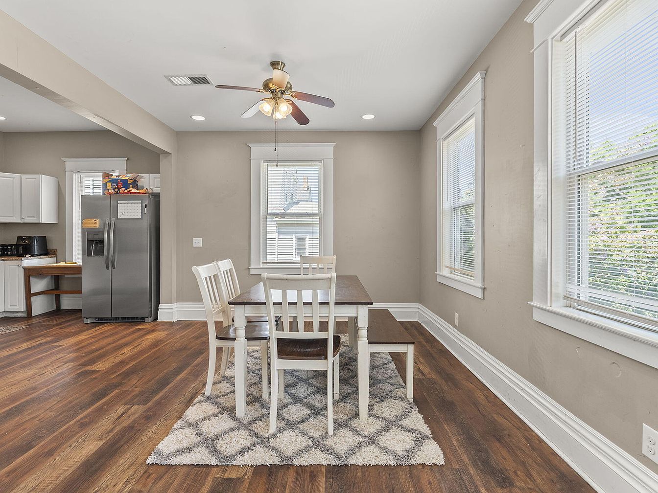 This dining area features a simple yet inviting design with a wooden table surrounded by white chairs, promoting a casual atmosphere. The warm tones of the dark hardwood floor contrast with the light beige walls, providing a cozy feel. Natural light pours in through the windows, framed with white casings, enhancing the space’s brightness. A plush area rug with a geometric pattern adds texture underfoot. Ceiling fans with light fixtures hang above, integrating functionality and aesthetics. Nearby, a modern stainless steel refrigerator integrates contemporary convenience within the open layout, connecting the dining area to the kitchen.
