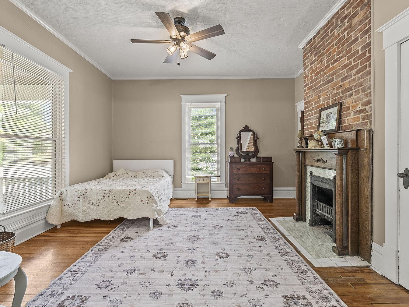 This cozy bedroom features a warm, earthy color scheme with beige walls that complement the rich, wooden flooring. A simple white bed dressed in a floral quilt adds a touch of softness, while a vintage dresser with a classic mirror enhances the room’s charm. A striking exposed brick wall behind the fireplace contrasts elegantly with the room’s light tones, adding rustic character. A ceiling fan provides a practical yet stylish element. Natural light filters through the large windows, highlighting a lovely area rug adorned with delicate floral patterns, creating a serene and inviting atmosphere.