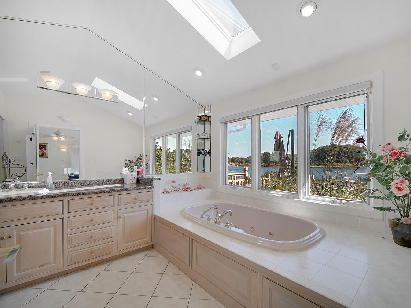 This spacious and inviting bathroom features a large soaking tub positioned beside generous windows that fill the space with natural light and offer serene views of a lake and lush greenery. A long vanity with double sinks provides ample storage with its light wood cabinetry and stone countertop, making it ideal for a family’s daily routines. The room is accented with soft cream tile flooring and white walls, complemented by tasteful floral arrangements for a fresh, welcoming touch. Overhead, recessed lighting and a skylight ensure a bright, cheerful atmosphere perfect for relaxation and family-friendly comfort.