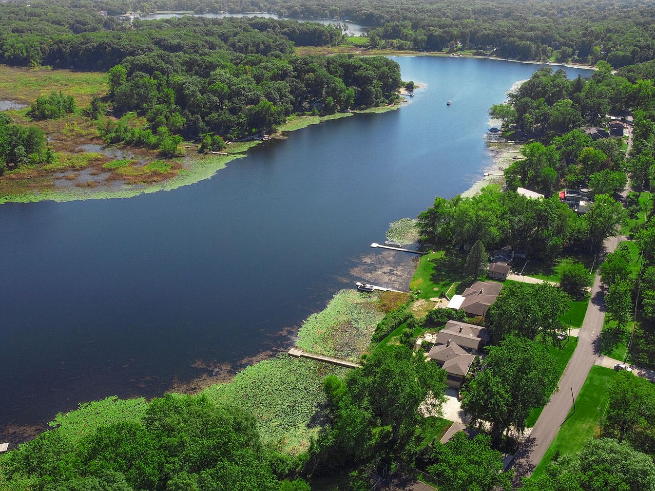 A serene overhead view highlights a peaceful lakefront residential neighborhood bordered by lush greenery and mature trees. Several family homes, each with spacious backyards, sit along the gentle curve of the lakeshore, offering private docks and space for outdoor activities. The tranquil blue water contrasts beautifully with the vibrant, well-maintained lawns and shaded gardens, providing a safe and relaxing environment for families to gather and play. Quiet streets wind through the neighborhood, enhancing the sense of community and safety. The overall scene evokes relaxation, outdoor enjoyment, and a perfect backdrop for a family-oriented lifestyle.