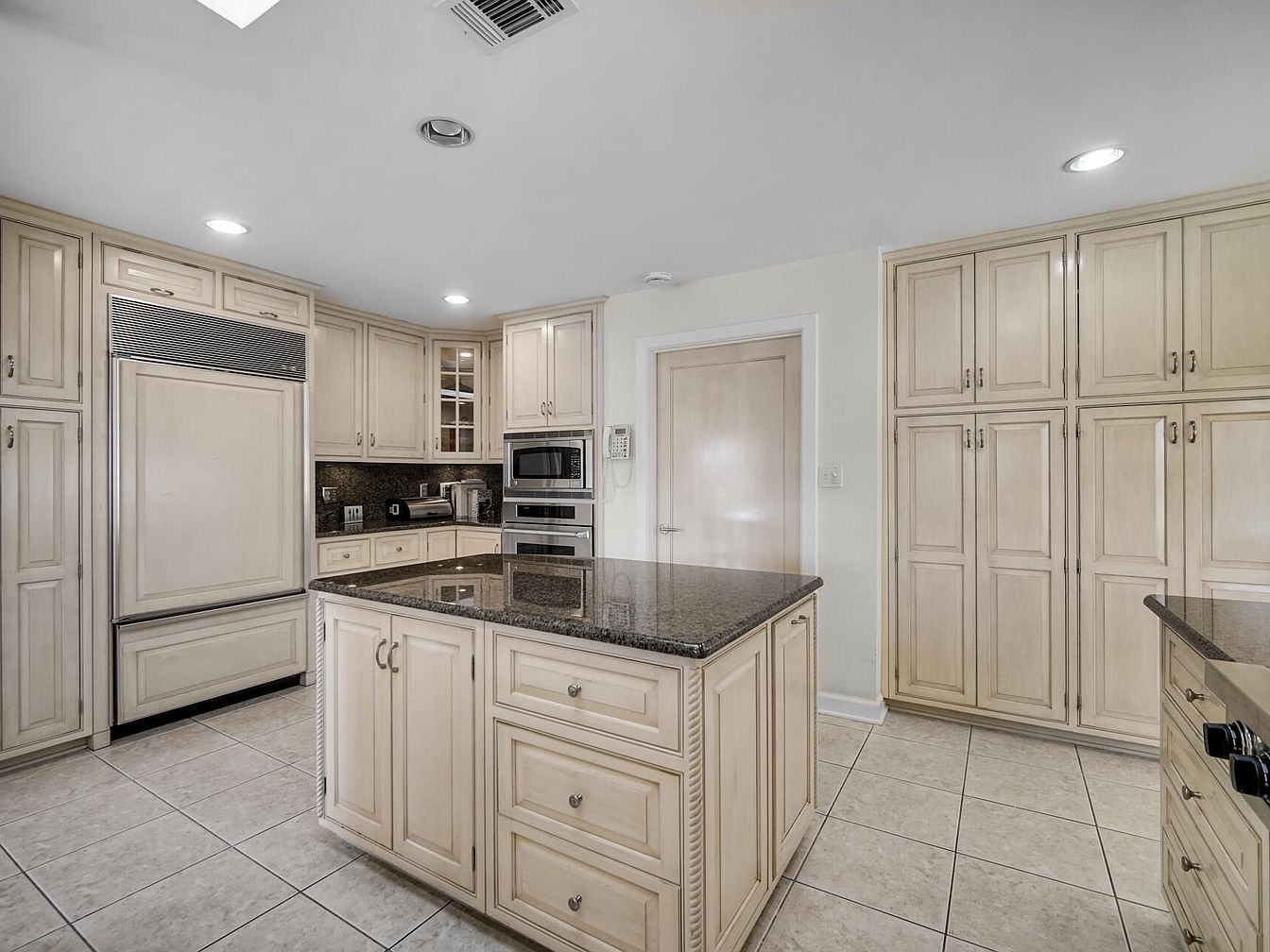 Spacious kitchen with an inviting center island and abundant cabinetry throughout. Cream-colored cabinets with raised panel doors and detailed woodwork are paired with sleek, dark granite countertops, creating a balanced and clean look. Stainless steel appliances, including a built-in refrigerator and wall oven, blend seamlessly into the cabinetry. The large island offers generous workspace and extra storage, making meal prep easy for families. Soft recessed lighting, neutral tile flooring, and light walls brighten the room, while ample cabinets provide plenty of space for pantry items and cookware, contributing to a highly organized and family-friendly atmosphere.
