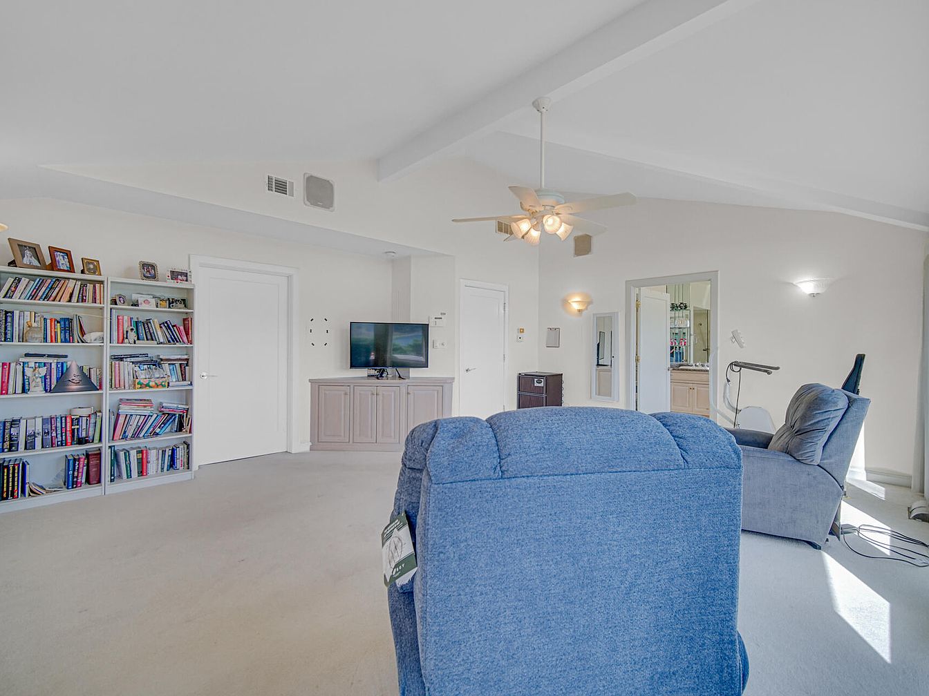 Spacious family living area featuring plush blue recliner seating, perfect for relaxing together or entertaining guests. The room has a soft, neutral color palette with off-white walls and light carpeting that enhances the airy atmosphere. Built-in shelving along one wall provides ample storage for books, games, and personal items, fostering a cozy space for family activities. A flat-screen TV sits atop a subtle pastel cabinet, positioned for optimal viewing. The vaulted ceiling with exposed beams and a ceiling fan enhances comfort and adds architectural interest, while large windows allow natural sunlight to brighten the room for a welcoming, family-friendly environment.