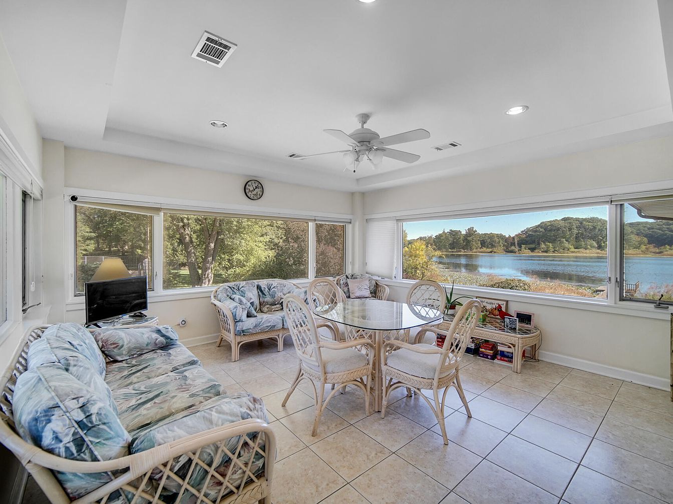 A spacious sunroom filled with natural light from large, wraparound windows that overlook a scenic lake and lush greenery. The room features tiled flooring, pale cream walls, and a white ceiling with recessed lighting and a ceiling fan for comfort. Cozy wicker furniture, including two floral-patterned sofas and a matching glass-top dining table with four chairs, creates a relaxed atmosphere perfect for family gatherings. A small TV sits on a side table for entertainment, while another corner table is stacked with board games and books, making this a family-friendly space ideal for enjoying views, playtime, or casual dining together.